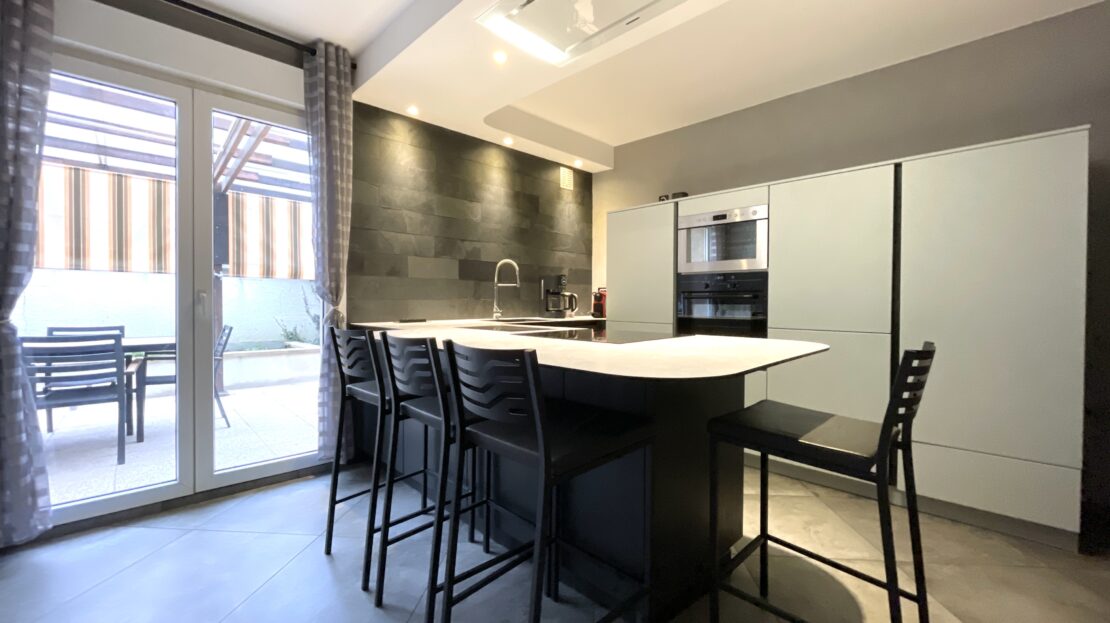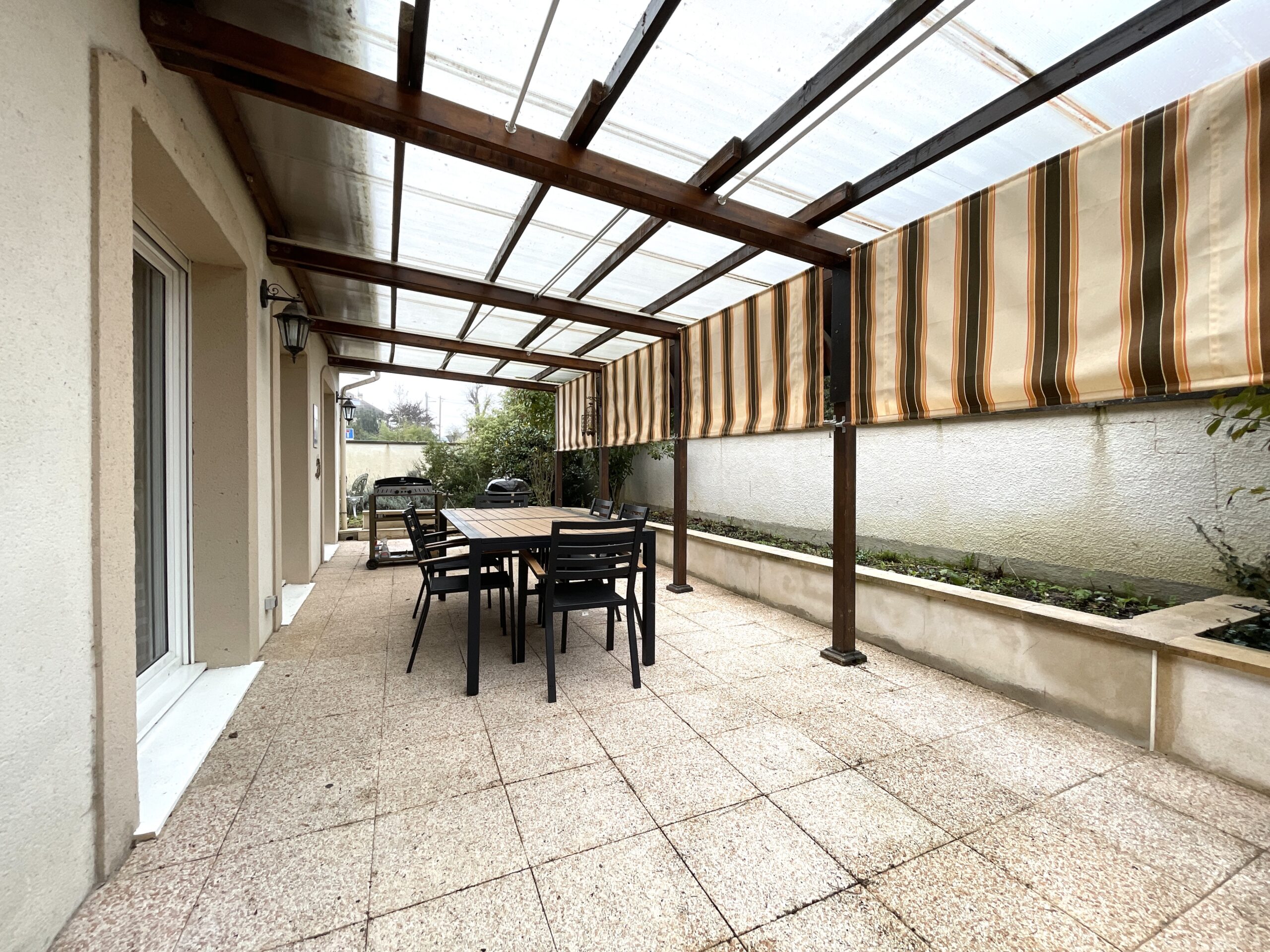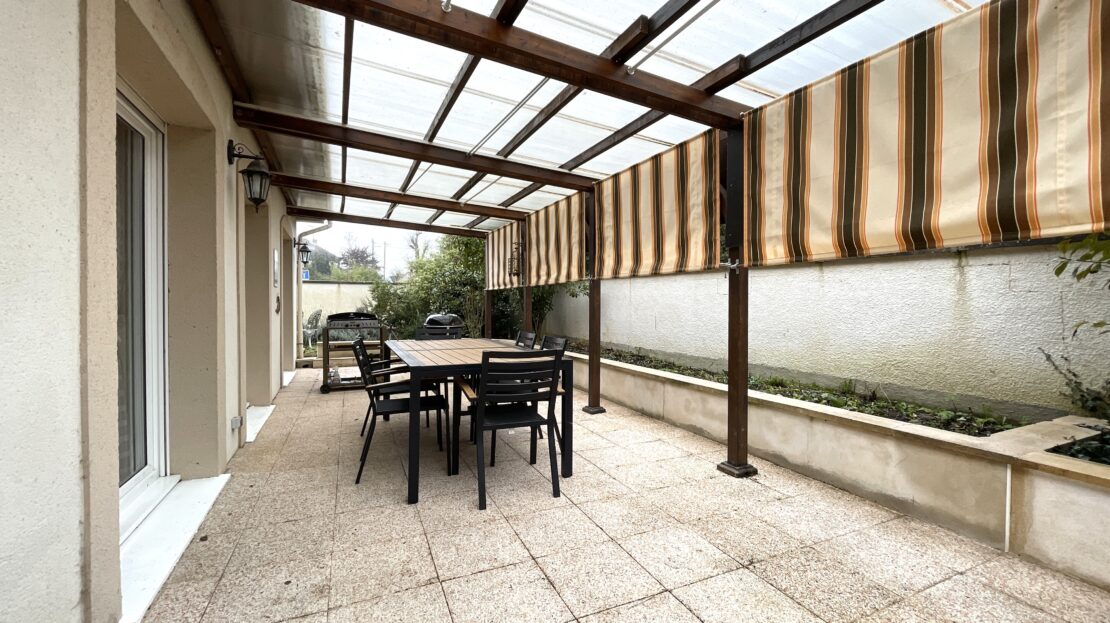 La grande terrasse orientée vers le jardin permet de profiter pleinement des repas en extérieur, des soirées d’été ou d’un barbecue entre amis.